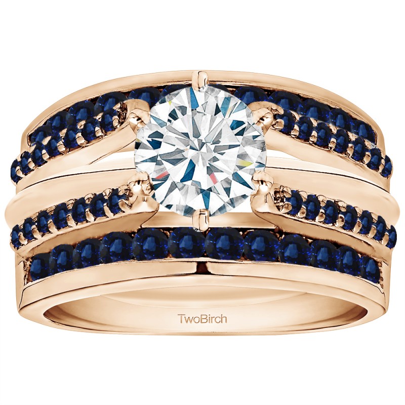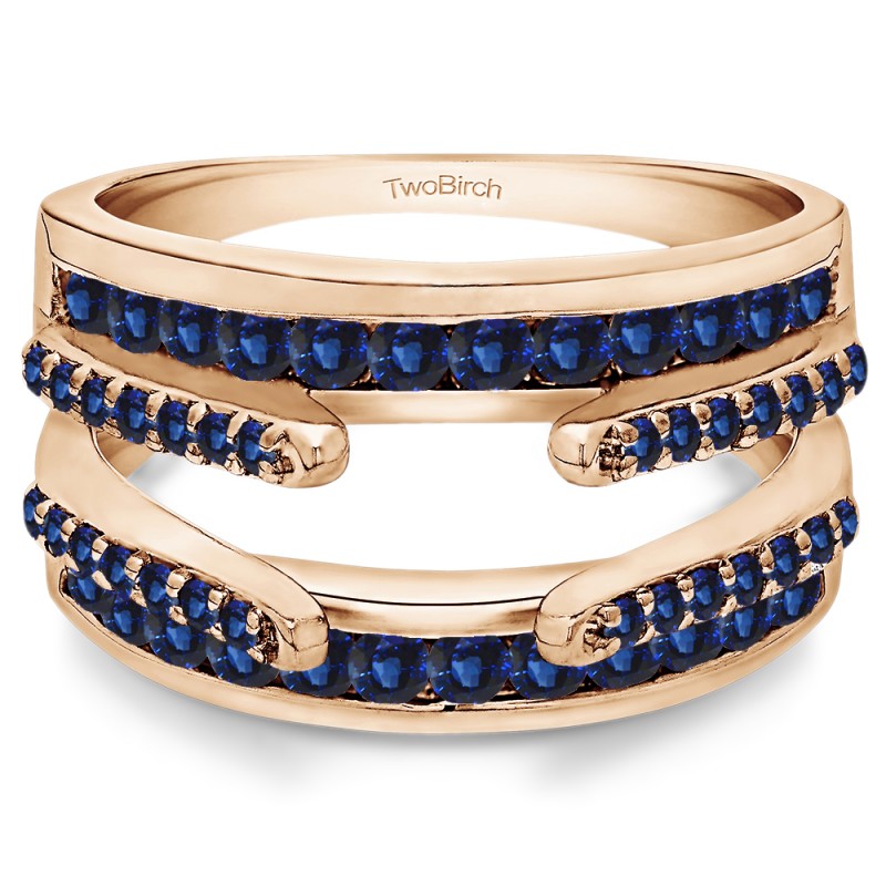 This wedding ring guard has 58 round, channel set stones. Each band measures 2.6 millimeters wide. This ring guard has 0.5 carats total weight. It is made to fit a round, princess or marquise cut solitaire from 0.5 carats to 1 carat.