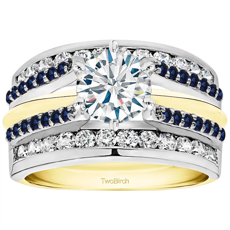 This wedding ring guard has 58 round, channel set stones. Each band measures 2.6 millimeters wide. This ring guard has 0.5 carats total weight. It is made to fit a round, princess or marquise cut solitaire from 0.5 carats to 1 carat.