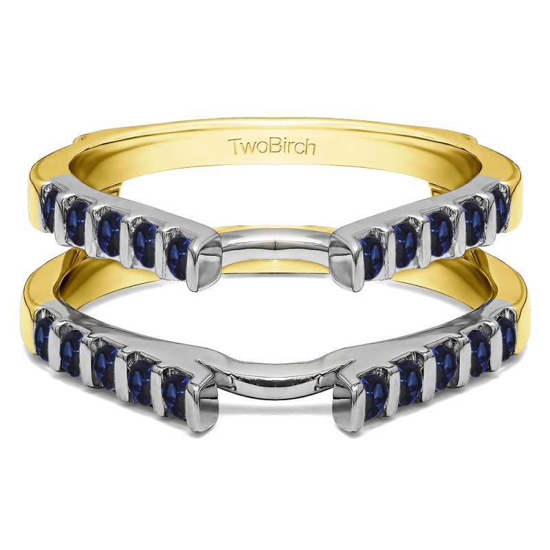 This wedding ring guard has 20 round, bar set stones. Each band measures 2 millimeters wide. This ring guard has 0.5 carats total weight. It is made to fit a round or princess cut solitaire from 0.5 carats to 2, or a marquise solitaire from 0.5 up to 1.5 carats.