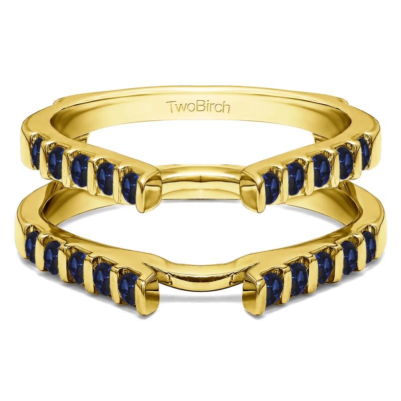 This wedding ring guard has 20 round, bar set stones. Each band measures 2 millimeters wide. This ring guard has 0.5 carats total weight. It is made to fit a round or princess cut solitaire from 0.5 carats to 2, or a marquise solitaire from 0.5 up to 1.5 carats.