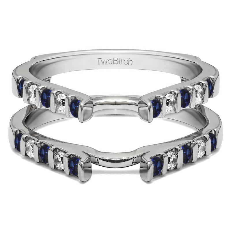 This wedding ring guard has 20 round, bar set stones. Each band measures 2 millimeters wide. This ring guard has 0.5 carats total weight. It is made to fit a round or princess cut solitaire from 0.5 carats to 2, or a marquise solitaire from 0.5 up to 1.5 carats.