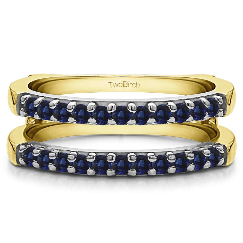 This wedding ring guard has 22 round, prong set stones. Each band measures 2.6 millimeters wide. This ring guard has 0.51 carats total weight. It is made to fit a round solitaire from 0.5 carats to 0.75, or a princess cut solitaire from 0.25 up to 0.5 carats.