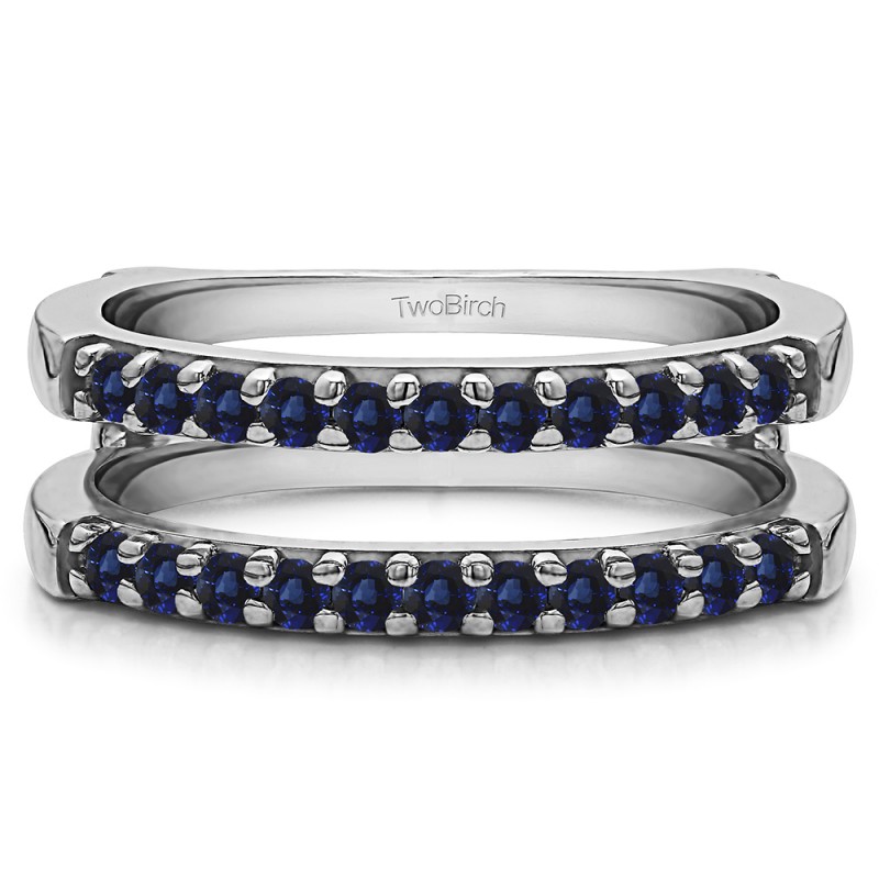 This wedding ring guard has 22 round, prong set stones. Each band measures 2.6 millimeters wide. This ring guard has 0.51 carats total weight. It is made to fit a round solitaire from 0.5 carats to 0.75, or a princess cut solitaire from 0.25 up to 0.5 carats.