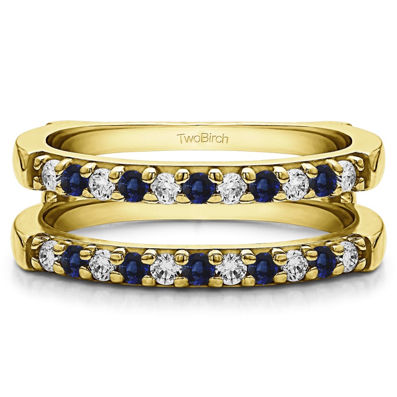 This wedding ring guard has 22 round, prong set stones. Each band measures 2.6 millimeters wide. This ring guard has 0.51 carats total weight. It is made to fit a round solitaire from 0.5 carats to 0.75, or a princess cut solitaire from 0.25 up to 0.5 carats.