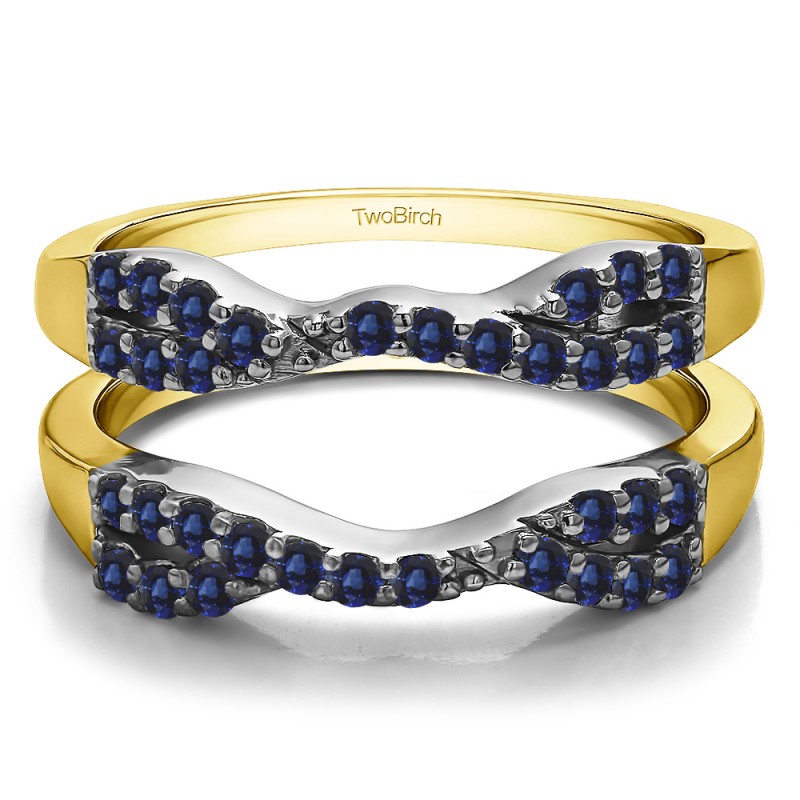 This wedding ring guard has 34 round, prong set stones. Each band measures 2 millimeters wide. This ring guard has 0.51 carats total weight. It is made to fit a round solitaire from 0.5 carats to 1.5, or a princess cut solitaire from 0.5 up to 2, or a marquise solitaire from 0.5 up to 1 carats.