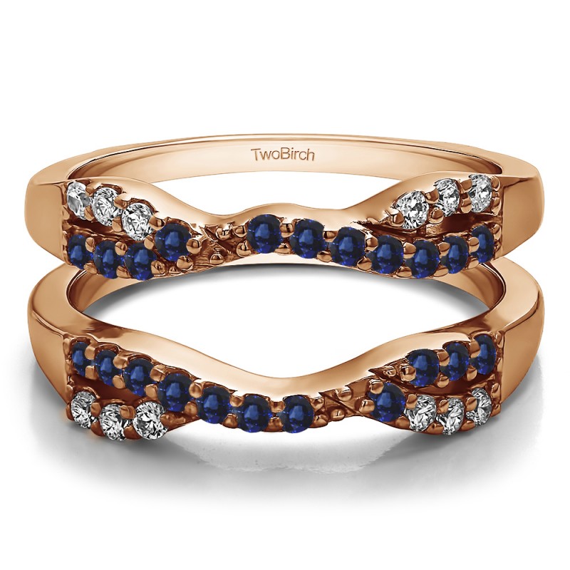 This wedding ring guard has 34 round, prong set stones. Each band measures 2 millimeters wide. This ring guard has 0.51 carats total weight. It is made to fit a round solitaire from 0.5 carats to 1.5, or a princess cut solitaire from 0.5 up to 2, or a marquise solitaire from 0.5 up to 1 carats.