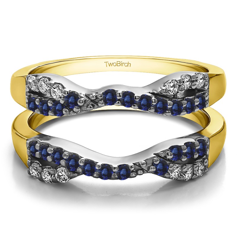 This wedding ring guard has 34 round, prong set stones. Each band measures 2 millimeters wide. This ring guard has 0.51 carats total weight. It is made to fit a round solitaire from 0.5 carats to 1.5, or a princess cut solitaire from 0.5 up to 2, or a marquise solitaire from 0.5 up to 1 carats.