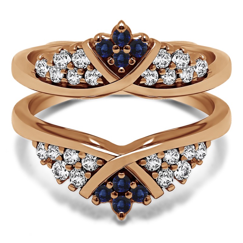 This wedding ring guard has 32 round, prong set stones. Each band measures 2 millimeters wide. This ring guard has 0.52 carats total weight. It is made to fit a round or princess cut solitaire from 0.25 carats to 2 carats.