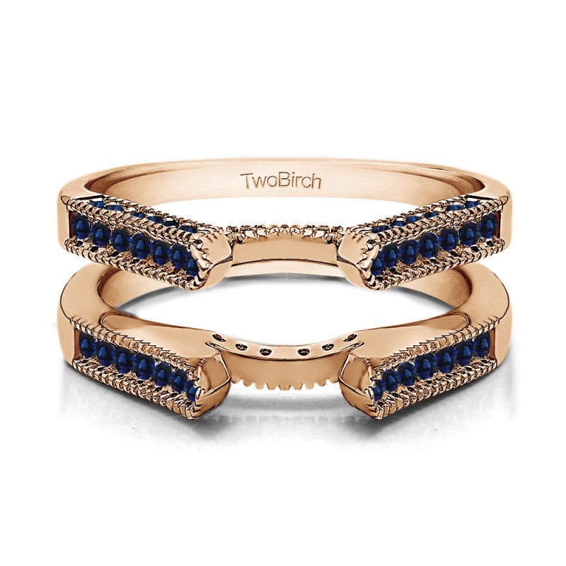 This wedding ring guard has 64 round, channel set stones. Each band measures 2 millimeters wide. This ring guard has 0.54 carats total weight.