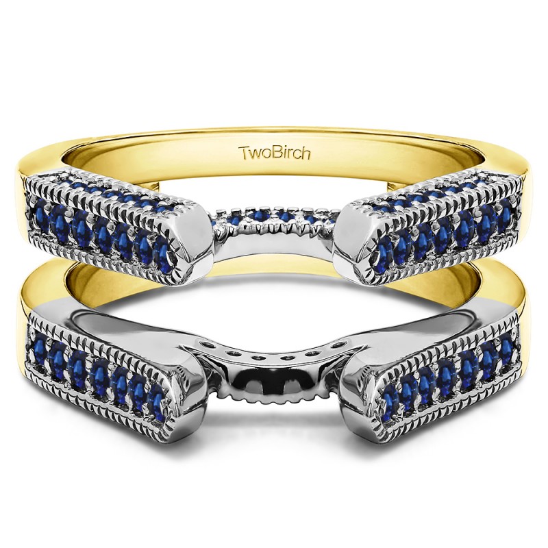 This wedding ring guard has 68 round, channel set stones. Each band measures 2 millimeters wide. This ring guard has 0.55 carats total weight. It is made to fit a round solitaire from 0.75 carats to 2, or a princess cut solitaire from 0.5 up to 2, or a marquise solitaire from 0.5 up to 1 carats.