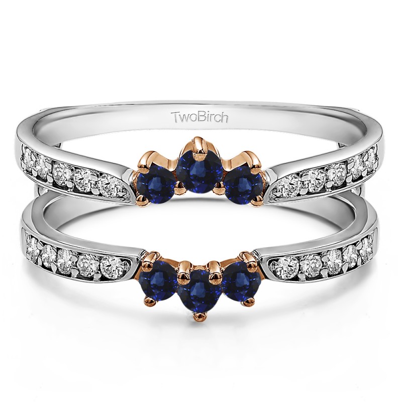 This wedding ring guard has 26 round, prong set stones. Each band measures 2.1 millimeters wide. This ring guard has 0.56 carats total weight. It is made to fit a round solitaire from 0.25 carats to 1.75, or a princess cut solitaire from 0.25 up to 2, or a marquise solitaire from 0.25 up to 0.5 carats.