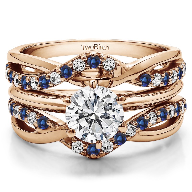 This wedding ring guard has 38 round, prong set stones. Each band measures 2.2 millimeters wide. This ring guard has 0.57 carats total weight. It is made to fit a round or princess solitaire from 1 carats to 1.5, or a princess cut solitaire from 0.75 up to 2 carats.
