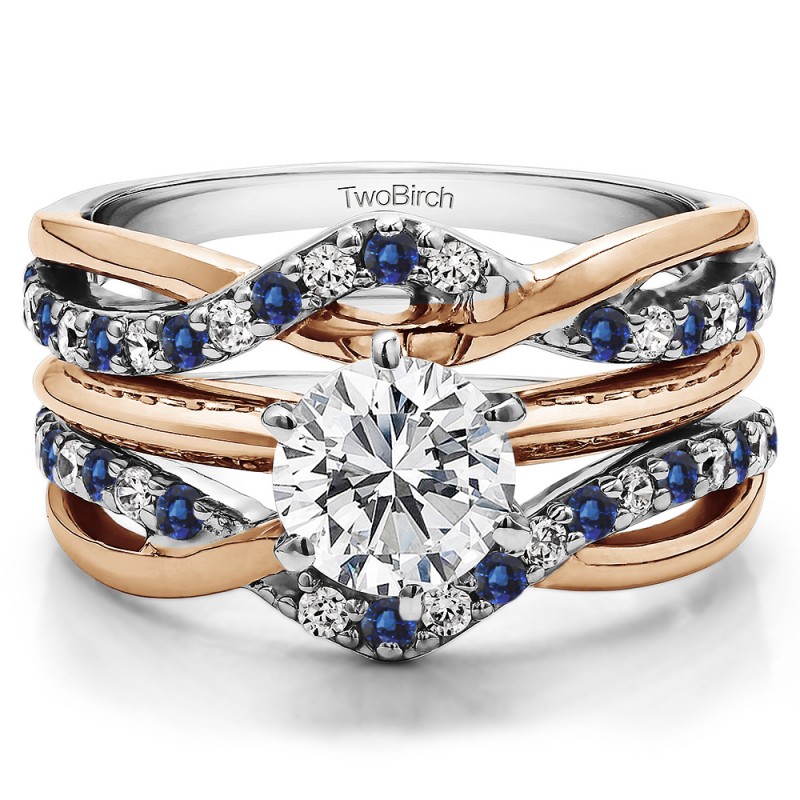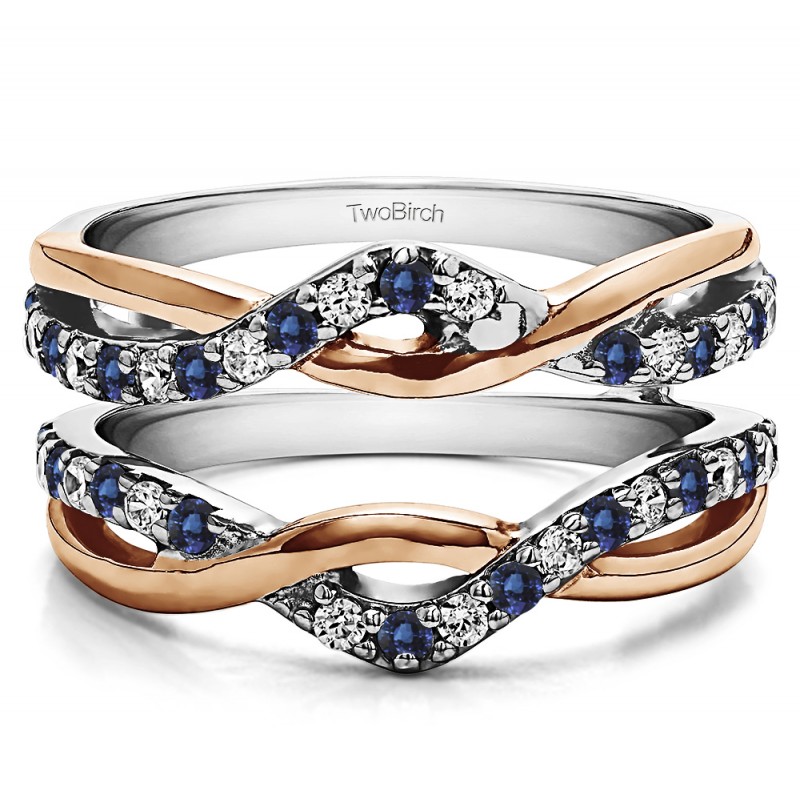 This wedding ring guard has 38 round, prong set stones. Each band measures 2.2 millimeters wide. This ring guard has 0.57 carats total weight. It is made to fit a round or princess solitaire from 1 carats to 1.5, or a princess cut solitaire from 0.75 up to 2 carats.