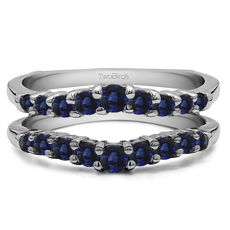 This wedding ring guard has 18 round, prong set stones. Each band measures 2.5 millimeters wide. This ring guard has 0.71 carats total weight. It is made to fit a round or princess cut solitaire from 0.2 carats to 2 carats.