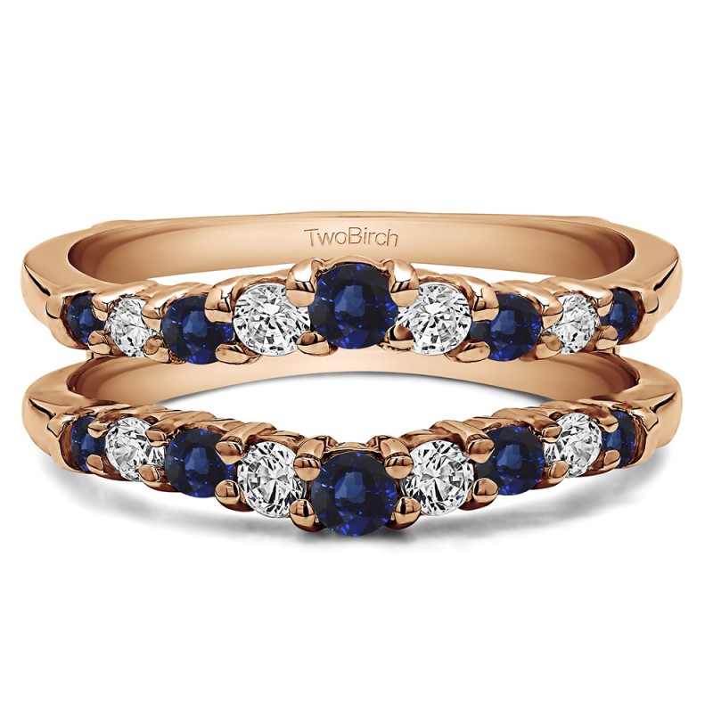 This wedding ring guard has 18 round, prong set stones. Each band measures 2.5 millimeters wide. This ring guard has 0.71 carats total weight. It is made to fit a round or princess cut solitaire from 0.2 carats to 2 carats.