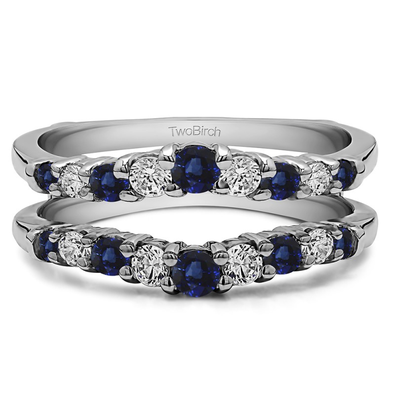 This wedding ring guard has 18 round, prong set stones. Each band measures 2.5 millimeters wide. This ring guard has 0.71 carats total weight. It is made to fit a round or princess cut solitaire from 0.2 carats to 2 carats.
