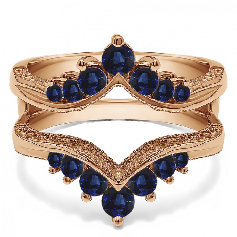 This wedding ring guard has 14 round, prong set stones. Each band measures 2.5 millimeters wide. This ring guard has 0.74 carats total weight. It is made to fit a round or princess cut solitaire from 0.5 carats to 2 carats.