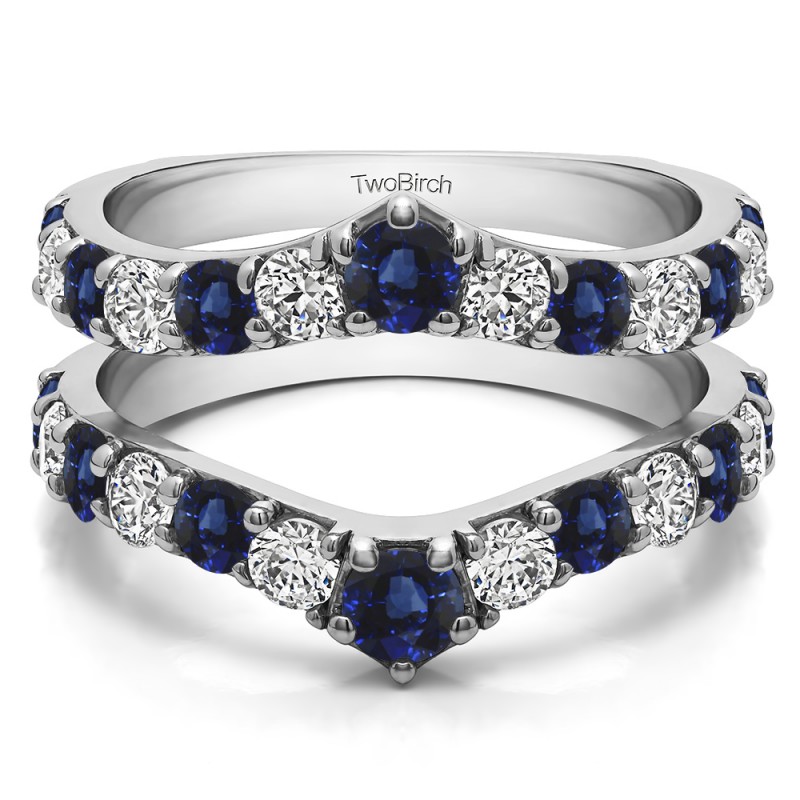 This wedding ring guard has 34 round, prong set stones. Each band measures 2 millimeters wide. This ring guard has 0.74 carats total weight. It is made to fit a round solitaire from 0.25 carats to 1 carats.