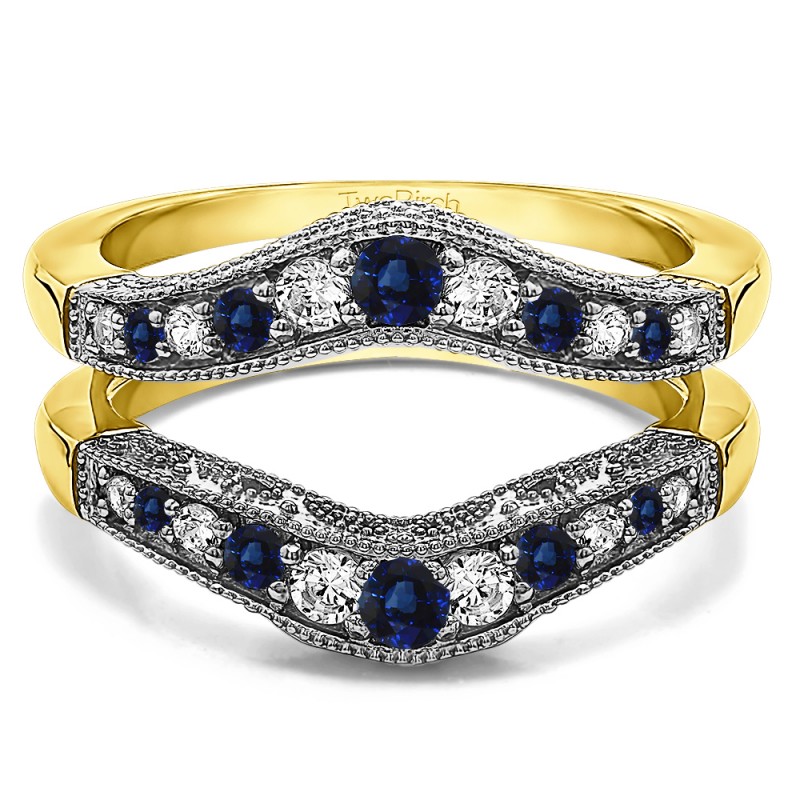 This wedding ring guard has 22 round, channel set stones. Each band measures 2 millimeters wide. This ring guard has 0.75 carats total weight. It is made to fit a round solitaire from 0.5 carats to 2, or a princess or marquise cut solitaire from 0.75 up to 2 carats.