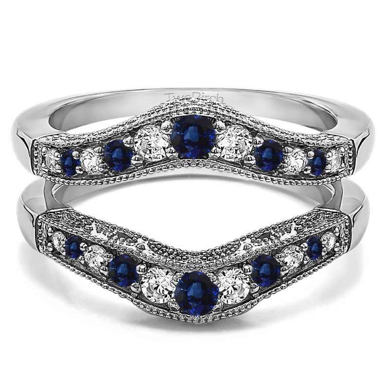 This wedding ring guard has 22 round, channel set stones. Each band measures 2 millimeters wide. This ring guard has 0.75 carats total weight. It is made to fit a round solitaire from 0.5 carats to 2, or a princess or marquise cut solitaire from 0.75 up to 2 carats.
