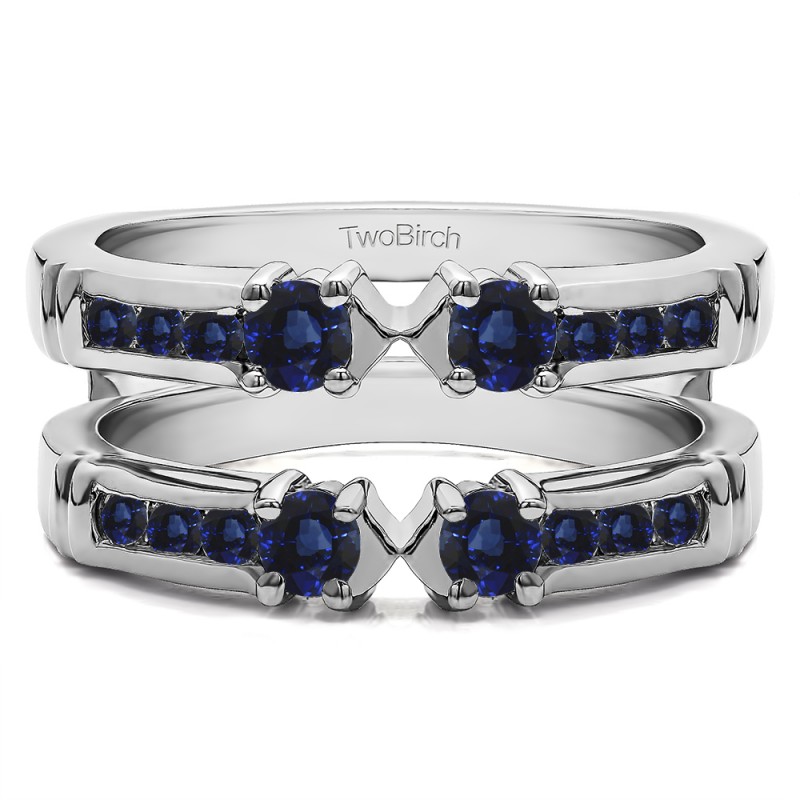 This wedding ring guard has 16 round, channel set stones. Each band measures 2.3 millimeters wide. This ring guard has 0.76 carats total weight. It is made to fit a round or princess cut solitaire from 0.25 carats to 2 carats.