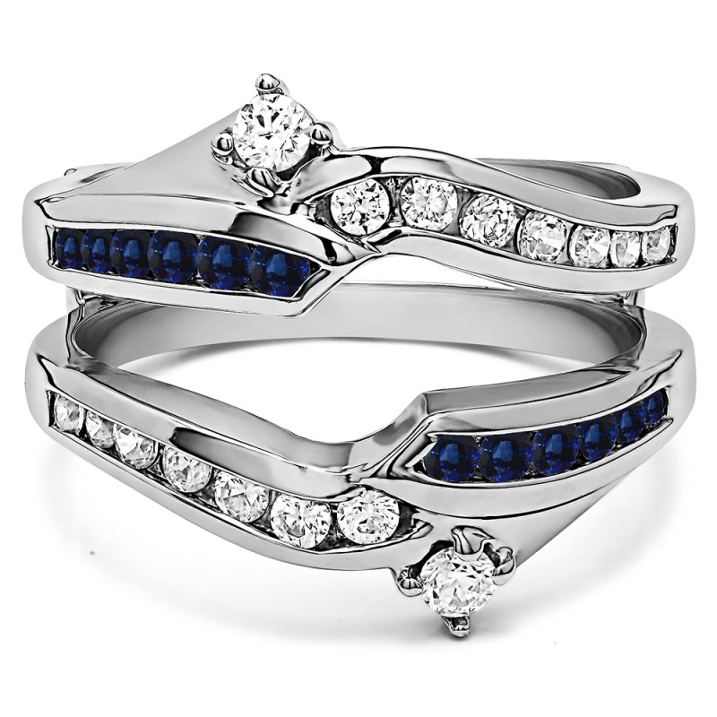 This wedding ring guard has 28 round, channel set stones. Each band measures 2 millimeters wide. This ring guard has 0.79 carats total weight.