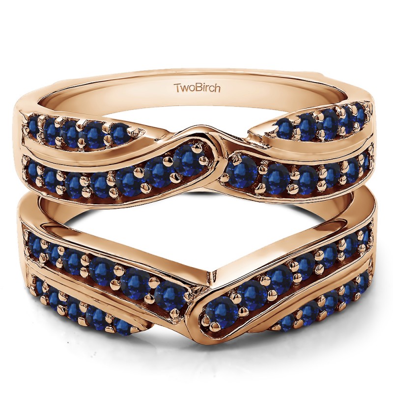 This wedding ring guard has 28 round, prong set stones. Each band measures 2 millimeters wide. This ring guard has .75 carats total weight. It is made to fit a round or princess cut solitaire from 0.5 carats to 2, or a marquise solitaire from 0.5 up to 1.5 carats.