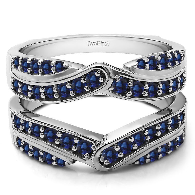 This wedding ring guard has 28 round, prong set stones. Each band measures 2 millimeters wide. This ring guard has .75 carats total weight. It is made to fit a round or princess cut solitaire from 0.5 carats to 2, or a marquise solitaire from 0.5 up to 1.5 carats.