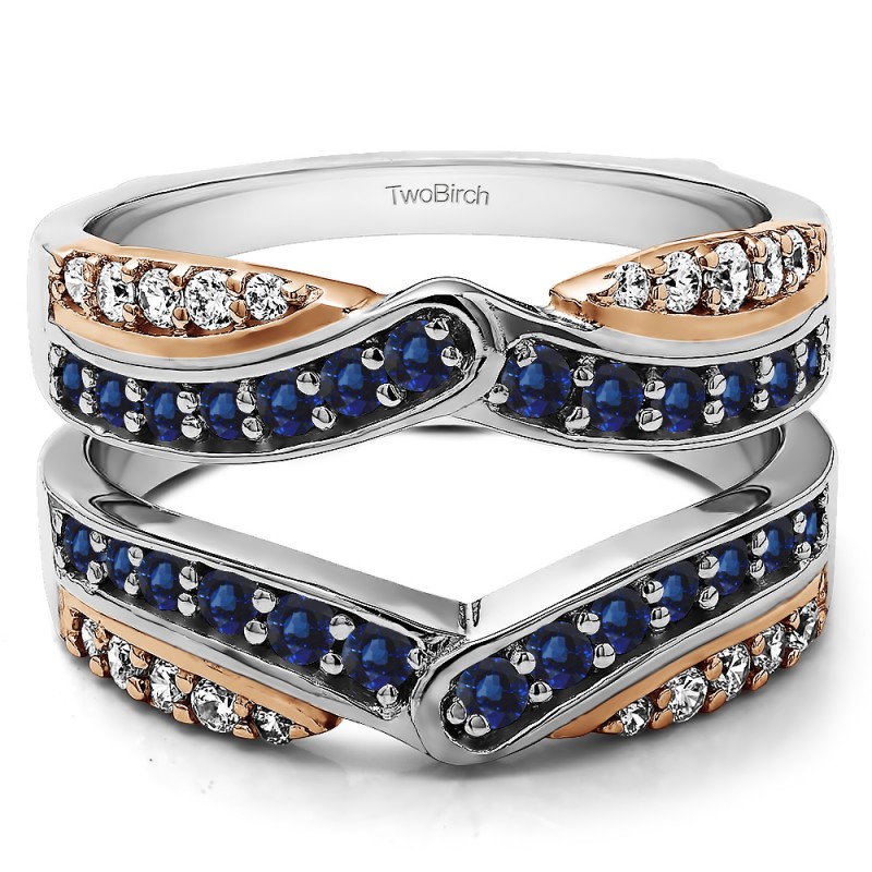 This wedding ring guard has 28 round, prong set stones. Each band measures 2 millimeters wide. This ring guard has .75 carats total weight. It is made to fit a round or princess cut solitaire from 0.5 carats to 2, or a marquise solitaire from 0.5 up to 1.5 carats.