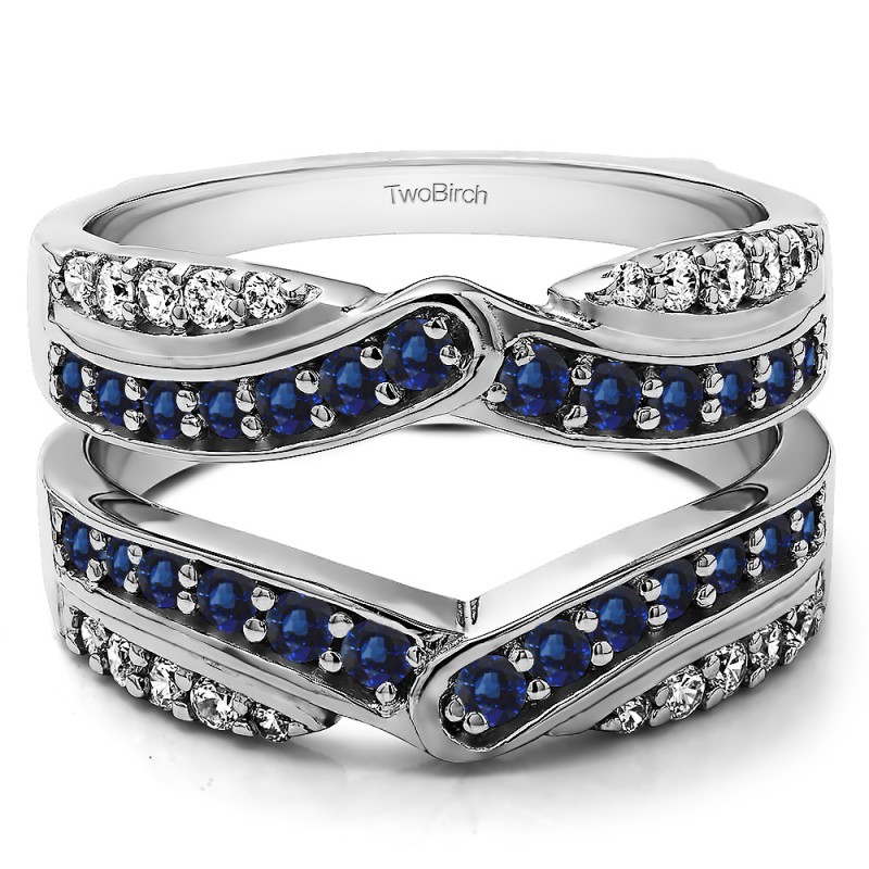 This wedding ring guard has 28 round, prong set stones. Each band measures 2 millimeters wide. This ring guard has .75 carats total weight. It is made to fit a round or princess cut solitaire from 0.5 carats to 2, or a marquise solitaire from 0.5 up to 1.5 carats.