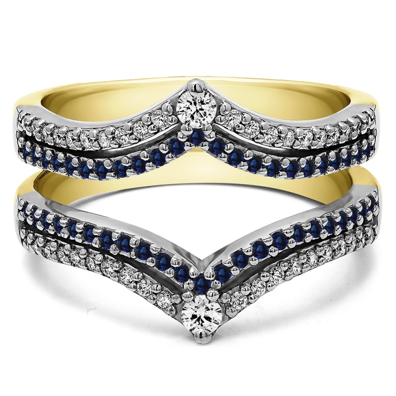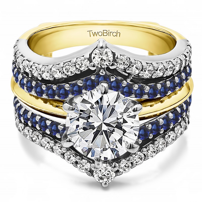 This wedding ring guard has 90 round, prong set stones. Each band measures 2 millimeters wide. This ring guard has 1.52 carats total weight. It is made to fit a round or princess cut solitaire from 0.5 carats to 2 carats.