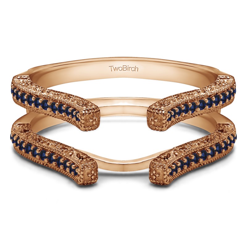 This wedding ring guard has 48 round, prong set stones. Each band measures 2.04 millimeters wide. This ring guard has 0.36 carats total weight. It is made to fit a round solitaire from 0.25 carats to 1.5, or a princess or marquise cut solitaire from 0.5 up to 1.5 carats.