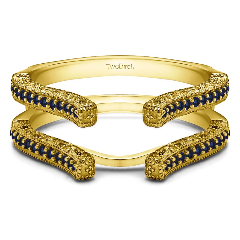 This wedding ring guard has 48 round, prong set stones. Each band measures 2.04 millimeters wide. This ring guard has 0.36 carats total weight. It is made to fit a round solitaire from 0.25 carats to 1.5, or a princess or marquise cut solitaire from 0.5 up to 1.5 carats.