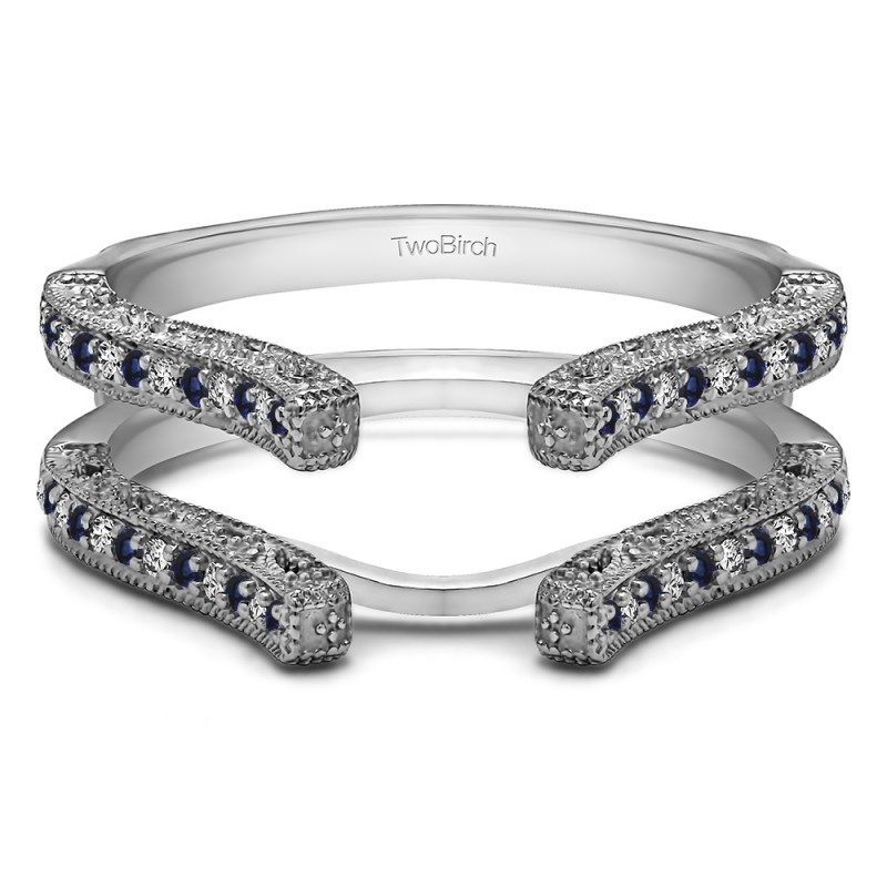 This wedding ring guard has 48 round, prong set stones. Each band measures 2.04 millimeters wide. This ring guard has 0.36 carats total weight. It is made to fit a round solitaire from 0.25 carats to 1.5, or a princess or marquise cut solitaire from 0.5 up to 1.5 carats.