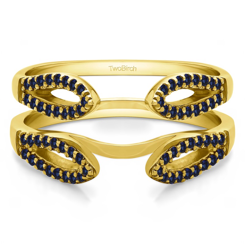 This wedding ring guard has 68 round, prong set stones. Each band measures 1.67 millimeters wide. This ring guard has 0.34 carats total weight. It is made to fit a round solitaire from 0.25 carats to 2, or a princess or marquise cut solitaire from 0.5 up to 1.5 carats.