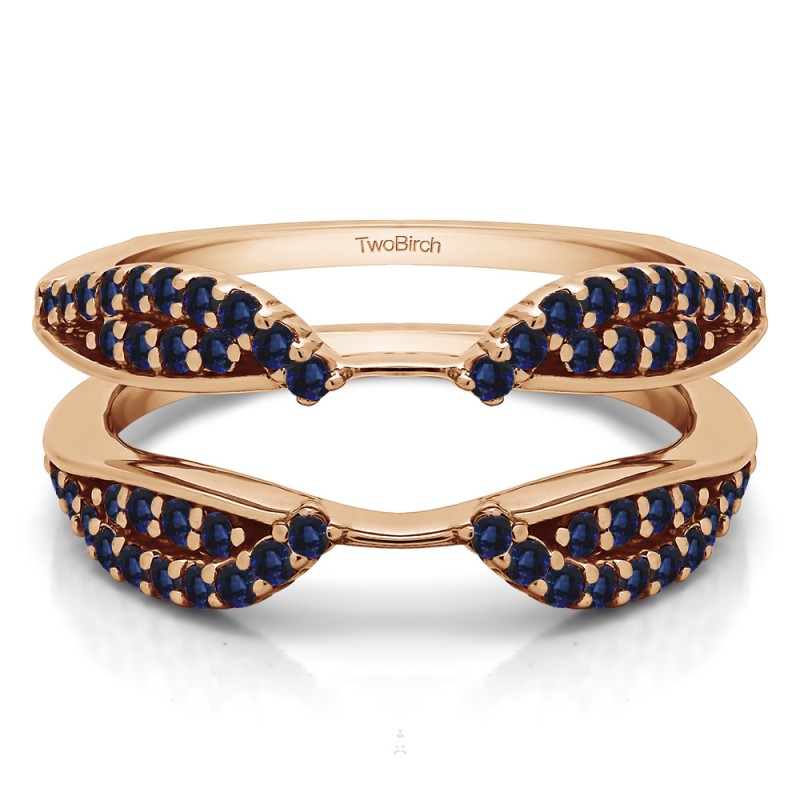This wedding ring guard has 56 round, prong set stones. Each band measures 1.33 millimeters wide. This ring guard has 0.56 carats total weight. It is made to fit a round solitaire from 0.5 carats to 2, or a princess cut solitaire from 0.5 up to 1, or a marquise solitaire from 0.5 up to 1.5 carats.