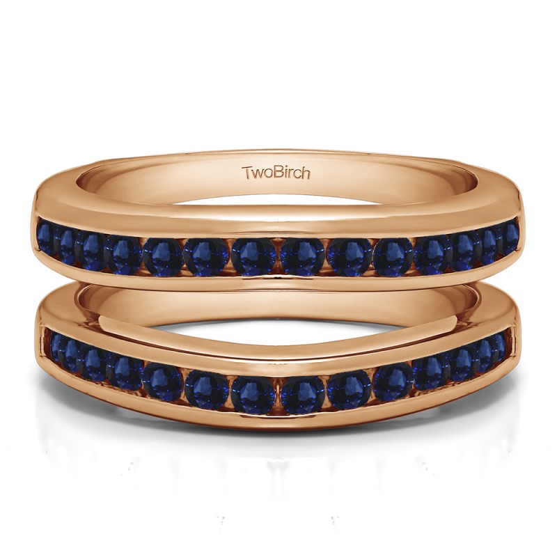 This wedding ring guard has 28 round, prong set stones. Each band measures 2.08 millimeters wide. This ring guard has 0.66 carats total weight. It is made to fit a round or princess cut solitaire from 0.25 carats to 2 carats.