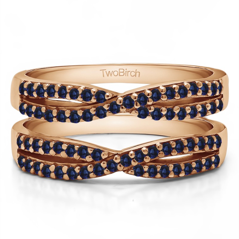 This wedding ring guard has 68 round, prong set stones. Each band measures 2.13 millimeters wide. This ring guard has 0.48 carats total weight. It is made to fit a round solitaire from 0.25 carats to 2, or a princess cut solitaire from 0.25 up to 1.5, or a marquise solitaire from 0.5 up to 1.5 carats.