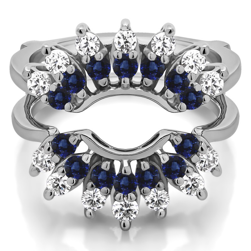 This wedding ring guard has 28 round, prong set stones. Each band measures 1.58 millimeters wide. This ring guard has 0.98 carats total weight. It is made to fit a round solitaire from 0.5 carats to 2, or a princess cut solitaire from 0.5 up to 1.5 carats.