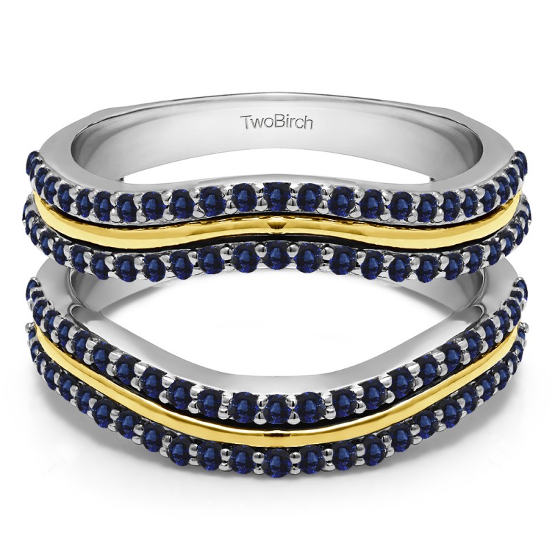 This wedding ring guard has 100 round, prong set stones. Each band measures 2.73 millimeters wide. This ring guard has 0.75 carats total weight. It is made to fit a round or princess cut solitaire from 0.5 carats to 2, or a marquise solitaire from 0.5 up to 1.5 carats.