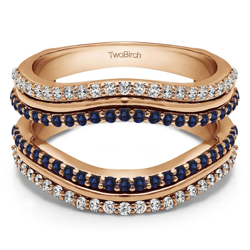 This wedding ring guard has 100 round, prong set stones. Each band measures 2.73 millimeters wide. This ring guard has 0.75 carats total weight. It is made to fit a round or princess cut solitaire from 0.5 carats to 2, or a marquise solitaire from 0.5 up to 1.5 carats.