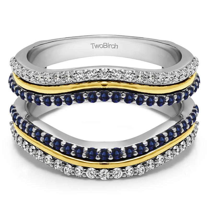 This wedding ring guard has 100 round, prong set stones. Each band measures 2.73 millimeters wide. This ring guard has 0.75 carats total weight. It is made to fit a round or princess cut solitaire from 0.5 carats to 2, or a marquise solitaire from 0.5 up to 1.5 carats.