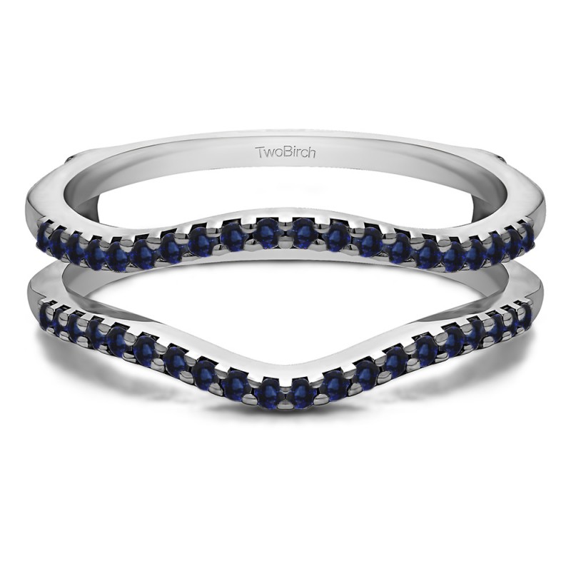 This wedding ring guard has 40 round, prong set stones. Each band measures 1.54 millimeters wide. This ring guard has 0.3 carats total weight. It is made to fit a round solitaire from 0.25 carats to 2, or a princess or marquise cut solitaire from 0.5 up to 1.5 carats.