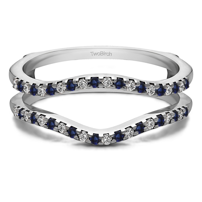 This wedding ring guard has 40 round, prong set stones. Each band measures 1.54 millimeters wide. This ring guard has 0.3 carats total weight. It is made to fit a round solitaire from 0.25 carats to 2, or a princess or marquise cut solitaire from 0.5 up to 1.5 carats.
