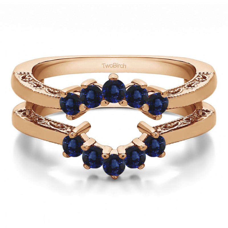 This wedding ring guard has 10 round, prong set stones. Each band measures 1.86 millimeters wide. This ring guard has 0.5 carats total weight. It is made to fit a round solitaire from 0.5 carats to 2, or a princess or marquise cut solitaire from 0.5 up to 1.5 carats.
