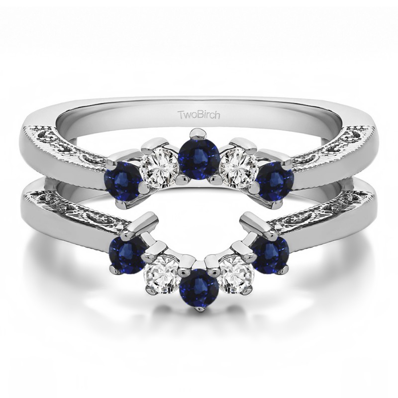 This wedding ring guard has 10 round, prong set stones. Each band measures 1.86 millimeters wide. This ring guard has 0.5 carats total weight. It is made to fit a round solitaire from 0.5 carats to 2, or a princess or marquise cut solitaire from 0.5 up to 1.5 carats.