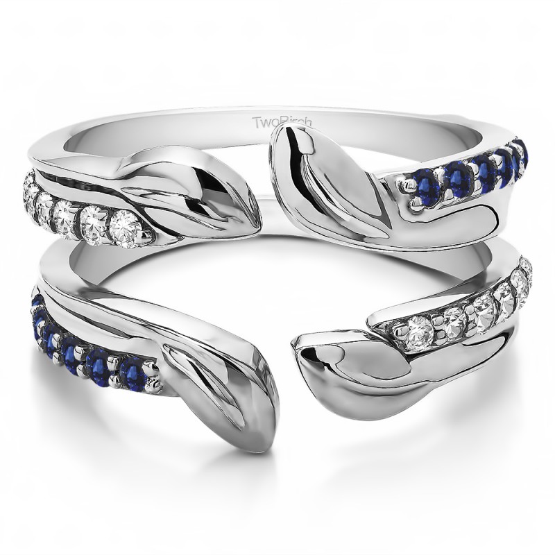 This wedding ring guard has 24 round, prong set stones. Each band measures 2.26 millimeters wide. This ring guard has 0.46 carats total weight. It is made to fit a round solitaire from 0.25 carats to 2, or a princess cut solitaire from 0.5 up to 2, or a marquise solitaire from 0.25 up to 1.5 carats.