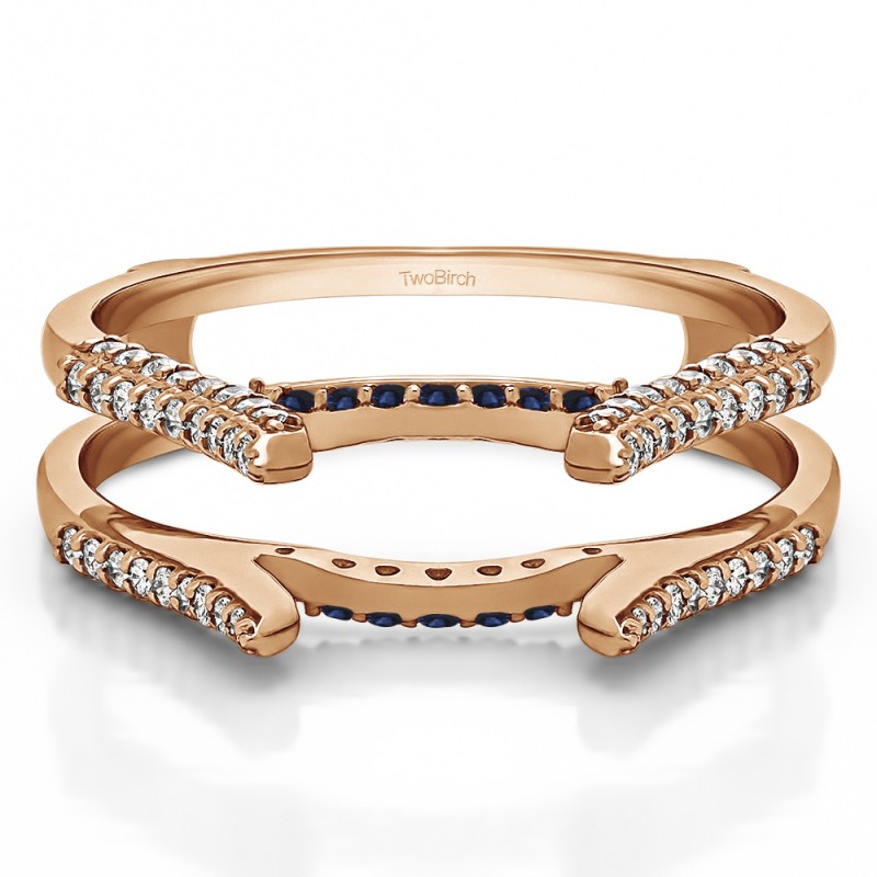 This wedding ring guard has 82 round, prong set stones. Each band measures 1.33 millimeters wide. This ring guard has 0.42 carats total weight. It is made to fit a round solitaire from 0.5 carats to 2, or a princess or marquise cut solitaire from 0.5 up to 1.5 carats.