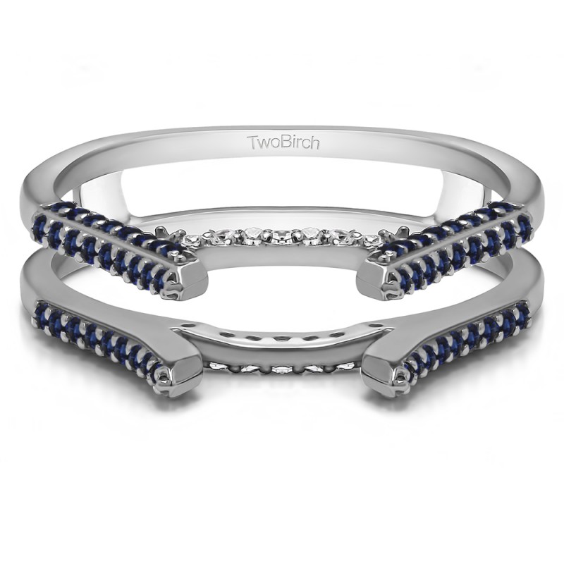 This wedding ring guard has 82 round, prong set stones. Each band measures 1.33 millimeters wide. This ring guard has 0.42 carats total weight. It is made to fit a round solitaire from 0.5 carats to 2, or a princess or marquise cut solitaire from 0.5 up to 1.5 carats.