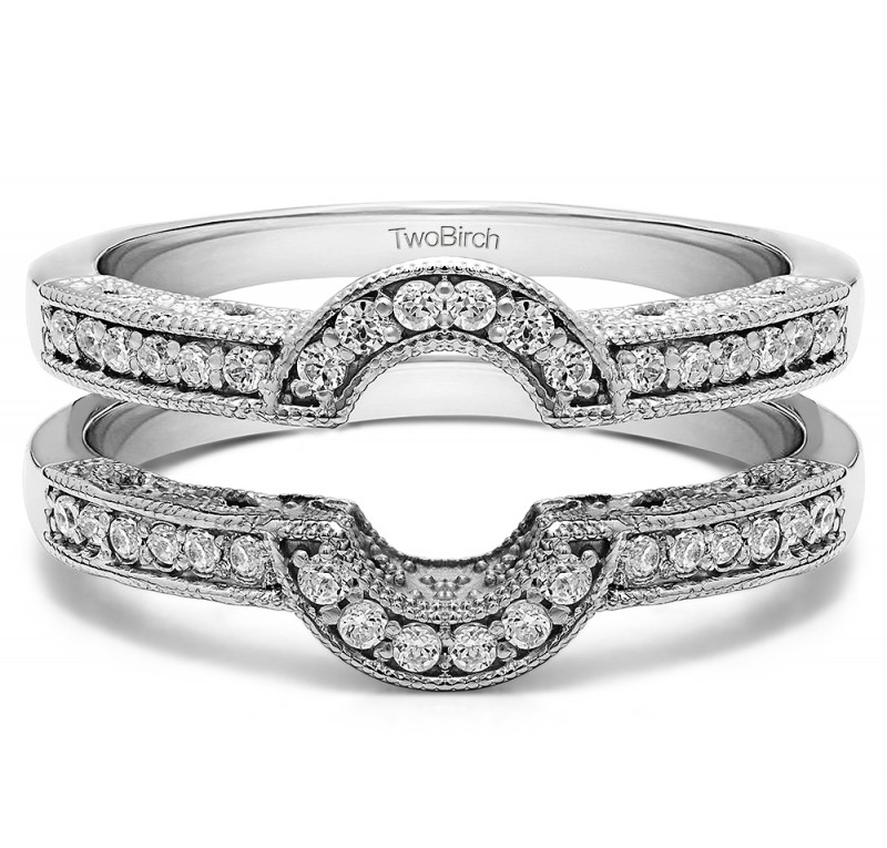 This wedding ring guard has 36 round, channel set stones. Each band measures 2 millimeters wide. This ring guard has 0.21 carats total weight. It is made to fit a round solitaire from 0.5 carats to 1 carats.